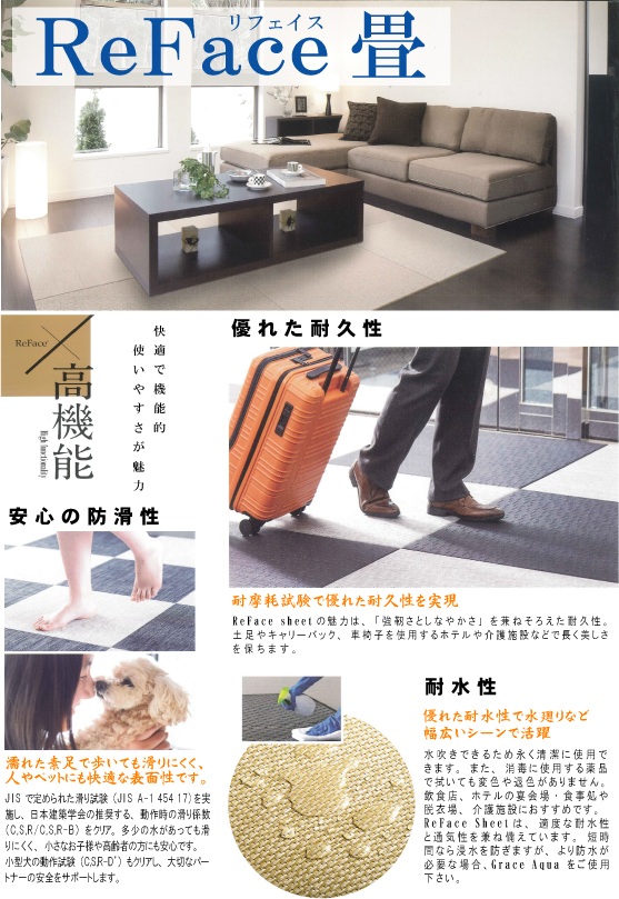 『ReFace/リフェイス』は、美しさ×高機能をコンセプトに開発された、耐久性の高い繊維を編み込んだ敷物です。優れた耐久性、安心の防滑性、耐水性などを備えた素新材のため、ペットとの共生にその機能が発揮されます!
